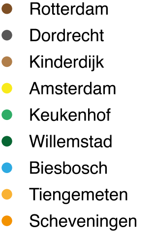 Dordrecht, Amsterdam, Lisse met de Keukenhof, Den Haag, Gouda, Utrecht etc.
